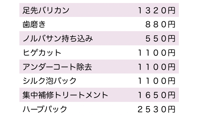 - 🍪 おやつタイム:トリミング中におやつを提供し、楽しくリラックスした時間をお届けします。